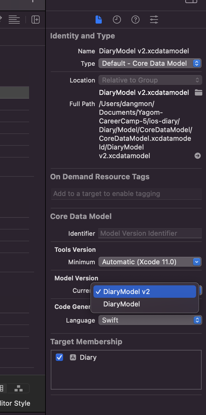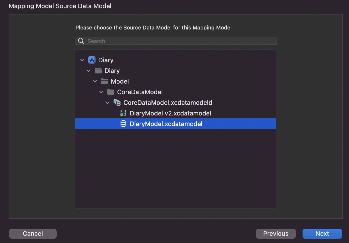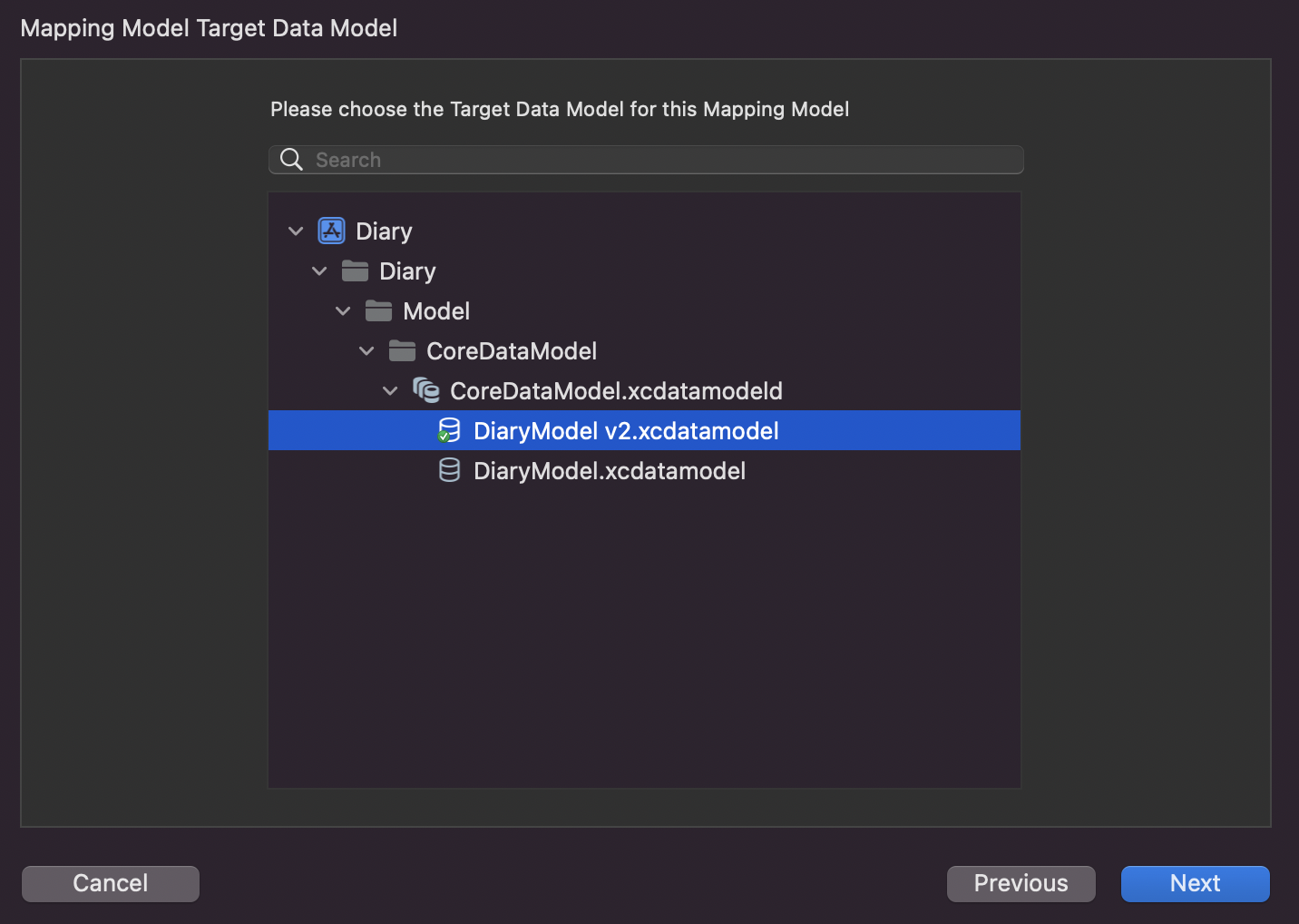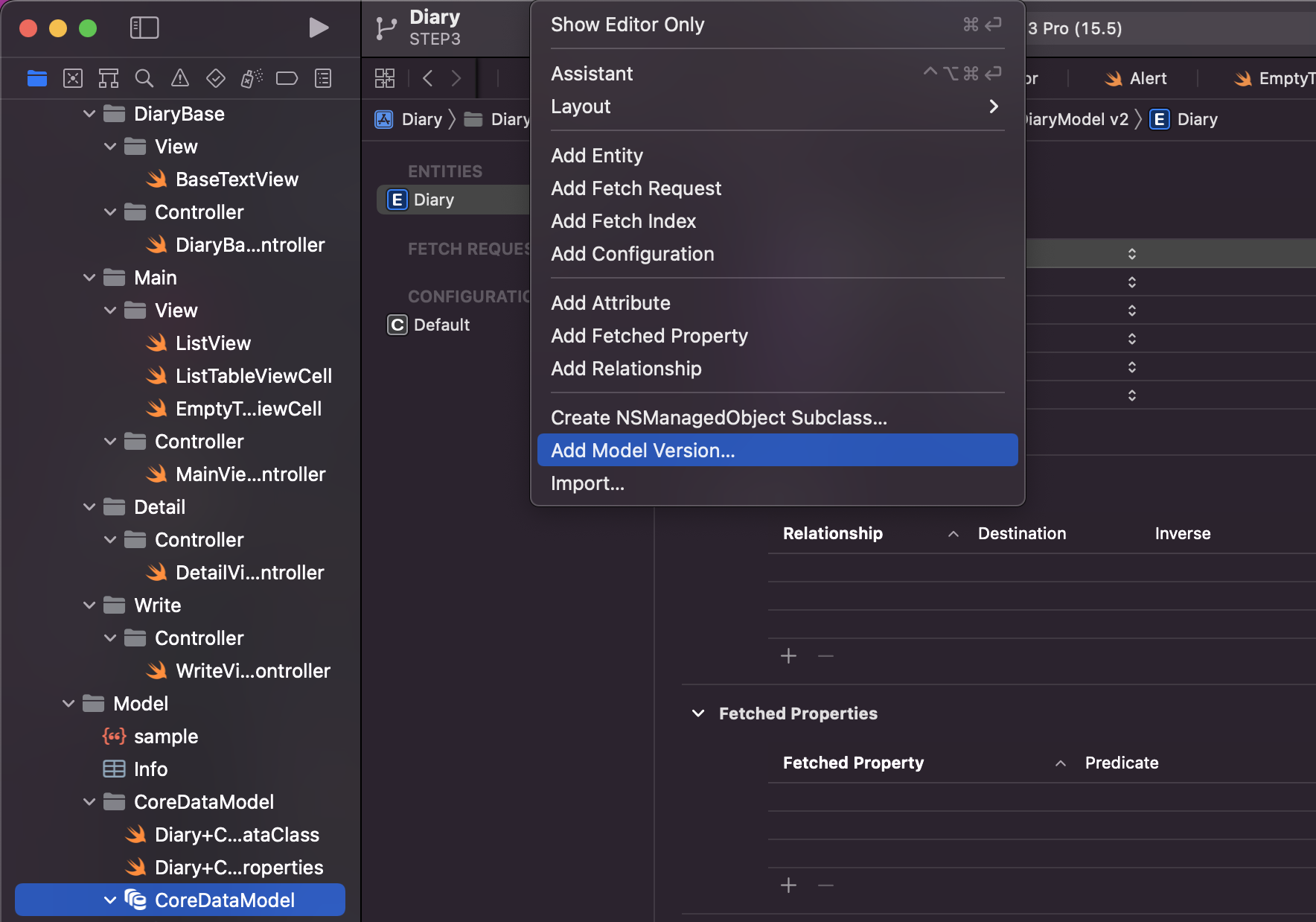 새로운 변경 사항을 위해 기존모델을 변경하면 안됩니다. 이전 사용자를 위해 보존하되 새로운 버전을 사용하는 사용자도 포용할 수 있어야겠죠 그러려면 .xcdatamodeld의 새로운 버전을 만들고 MappingModel로 구현을 하면 끝입니다.