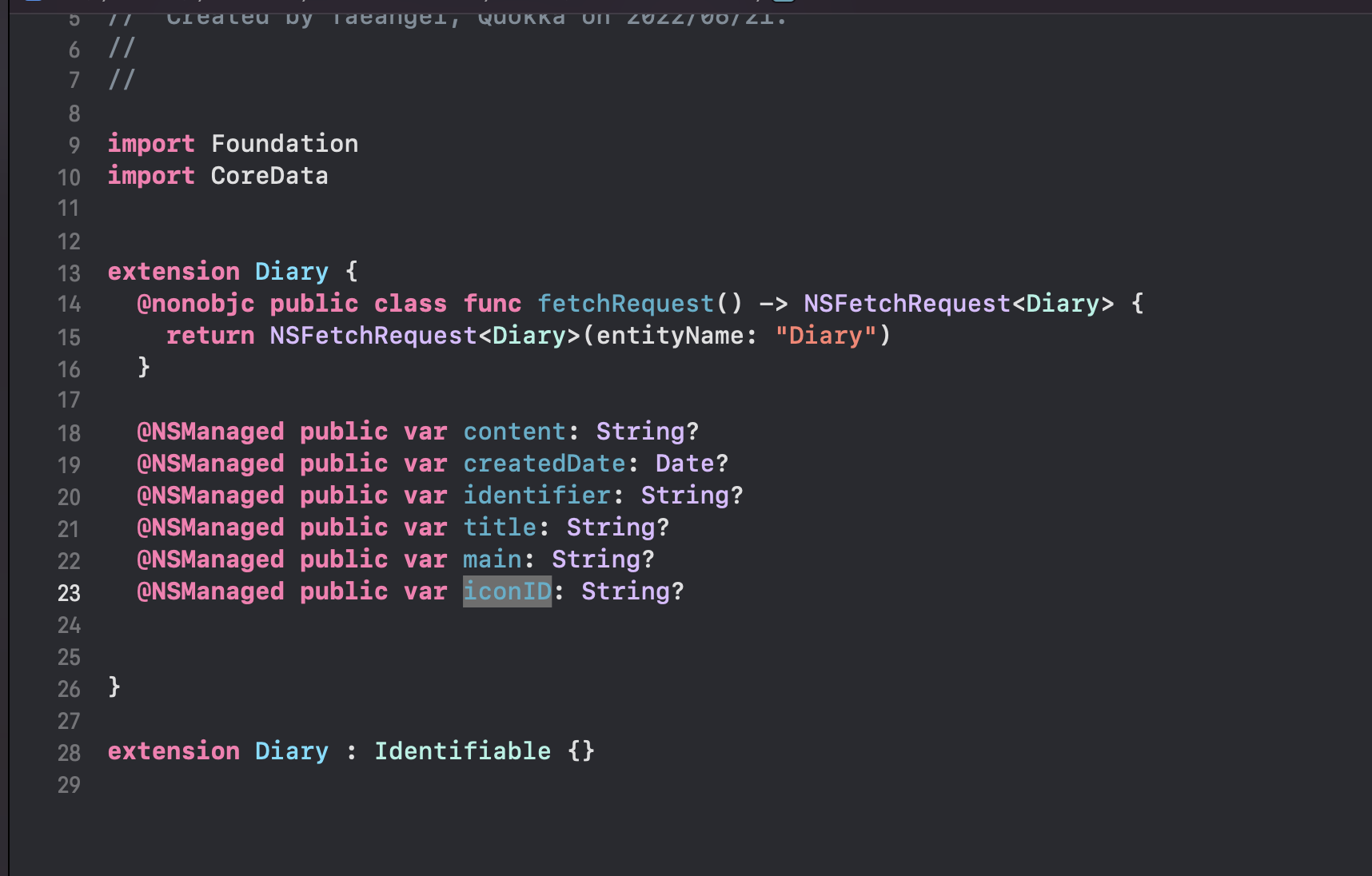 마지막으로 attribute가 추가되었기때문에 CoreData의 프로퍼티도 추가해주어야합니다.
