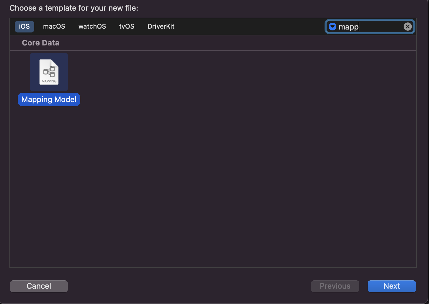 네번째로 이전버전과 현재버전을 연결해줄 mapping Model 파일을 새로 만듭니다.