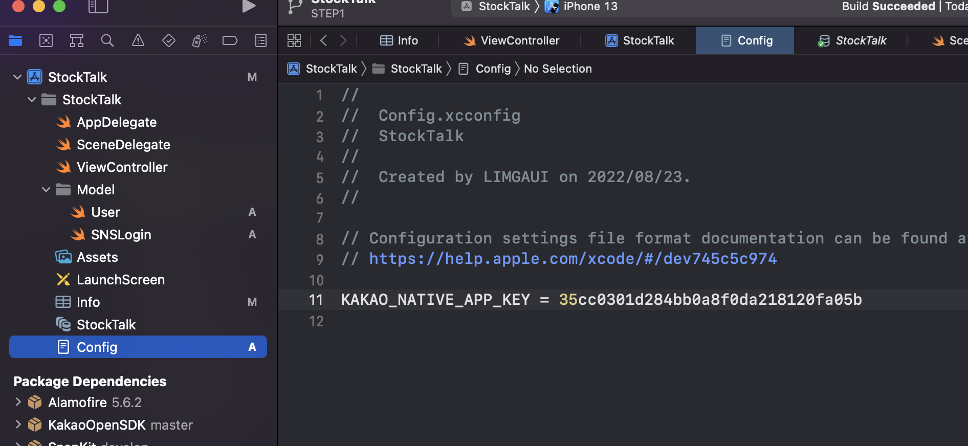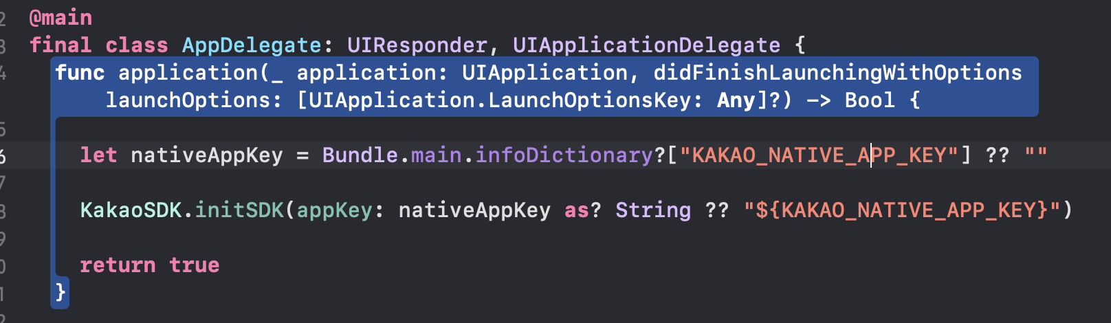 - AppDelegate에서 KakaoSDKCommon을 import한 후 런치메서드내에 KakaoSDK.init으로 appkey를 넣어준다 -> config에 네이티브앱 키를 저장했던 변수명을 넣어주면됨