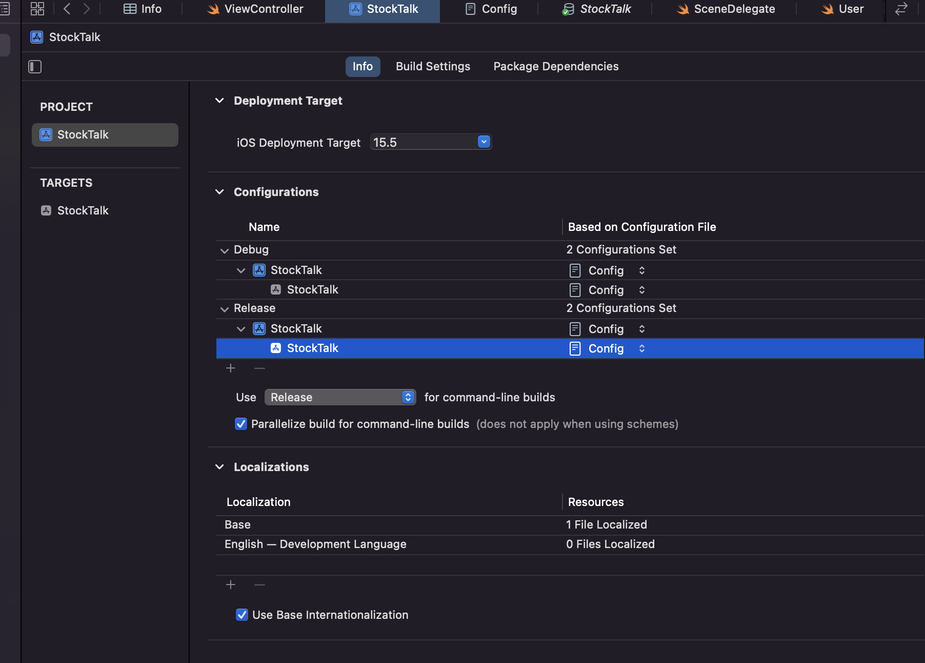 마지막으로 프로젝트 파일 -> Info -> configureation에 가서 Debug와 Realease를 config파일로 등록해준다.