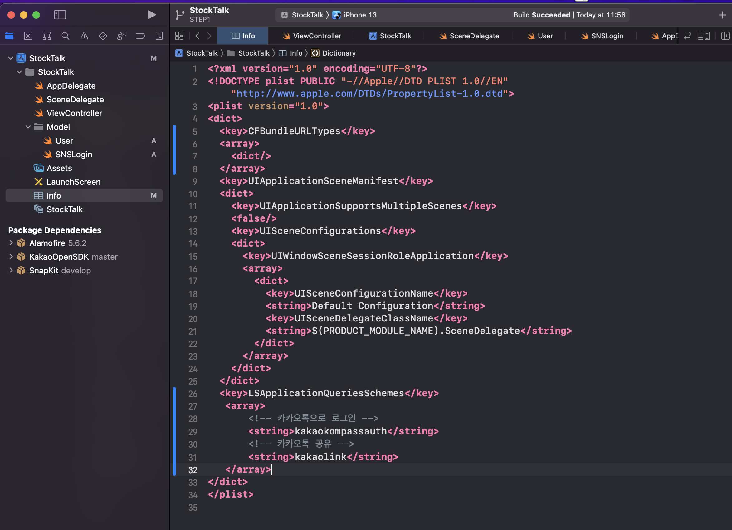- AppDelegate와 ScenDelegate에 카카오 url로 접근해서 현재 등록된 scheme과 일치할경우 앱에 접근할 수 있또록하는 코드를 각각 추가해준다. (사이트참고)