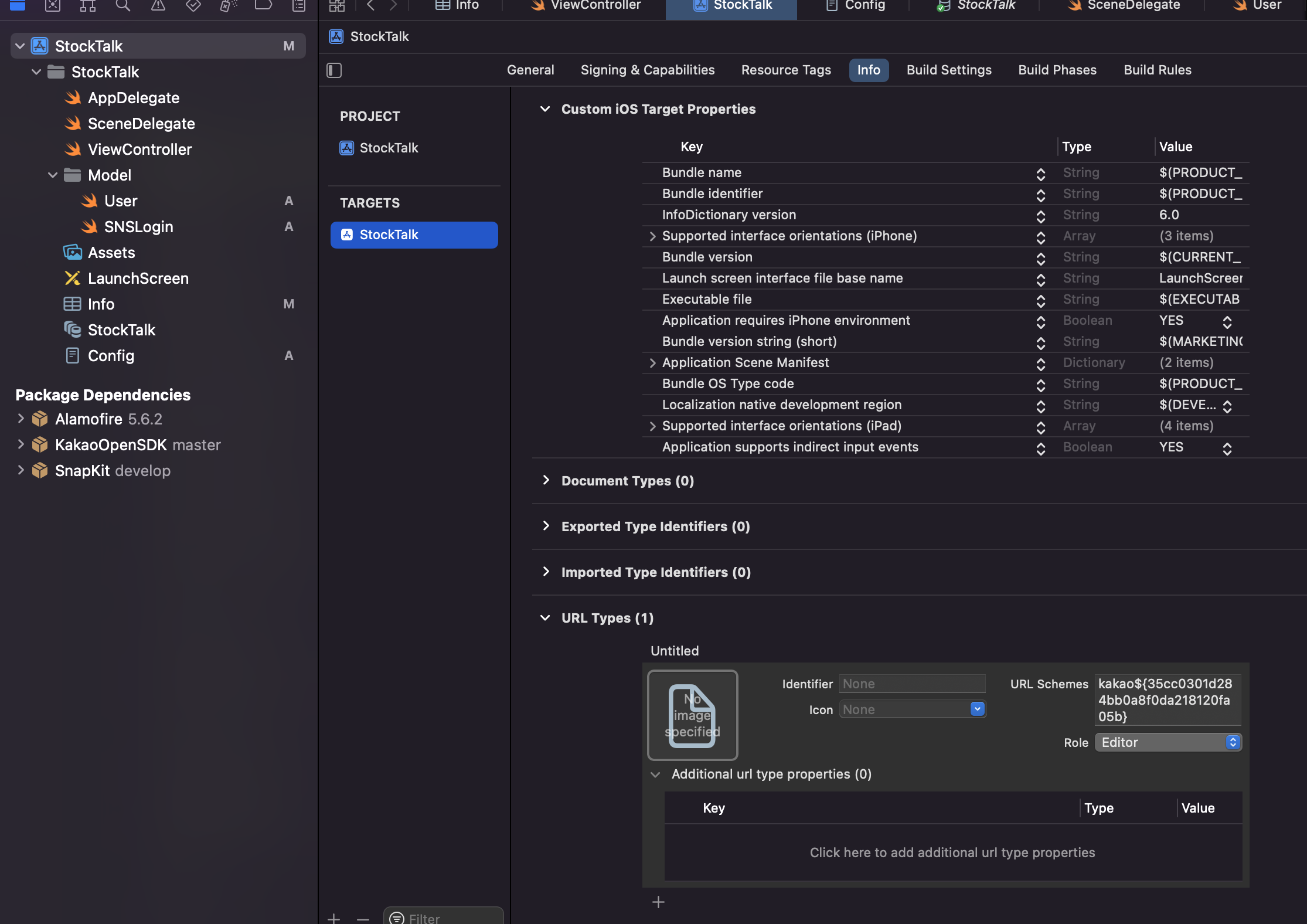 - config파일에 네이티브키를 저장하고 이를 ${} 를 이용해 Info.list에 추가해준다. 그다음 프로젝트파일 -> 타겟 -> URL TYPE에서 URL scheme을 네이티브앱 ${네이티브앱키}로 넣어준다.