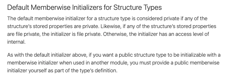 기본 멤버이니셜라이저는 구조체타입을 위한 것이다. 이는 구조체의 저장된 프로퍼티가 어느하나라도 private일 경우 Memberwise initialzer 자체를 private인 것으로 간주한다. 만약 어느한 프로퍼티가 filprivate이면 initialzer자체를 filprivate으로 간주한다는 것이다. 접근제어자가 별도로 설정이 되어있지않으면 기본 범위인 internal로 지정이된다.