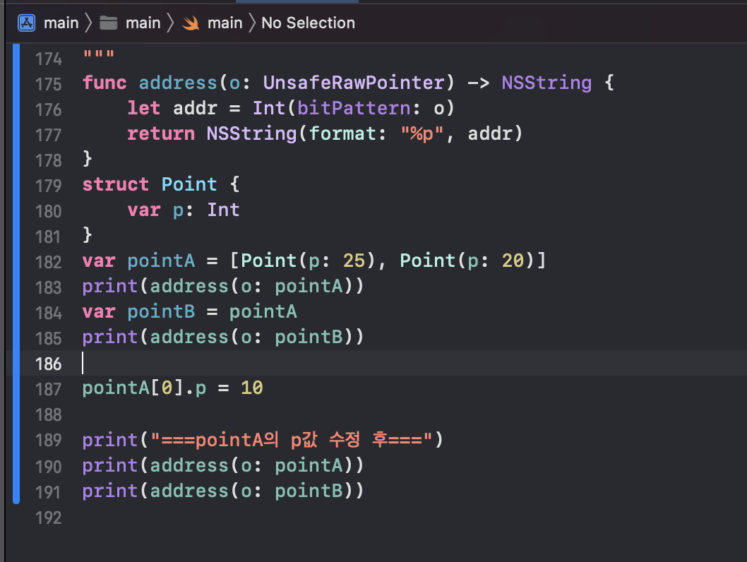 큰 배열의 값을 함수에 전달하는 것을.. 그런데 분명히 큰 배열의 값의 전체를 복사하는 것은 효율적인 방법이 아닐 것이다. 그래서 기꺼이 스위프트는 Copy On Write라는 매커니즘을 만들었다.