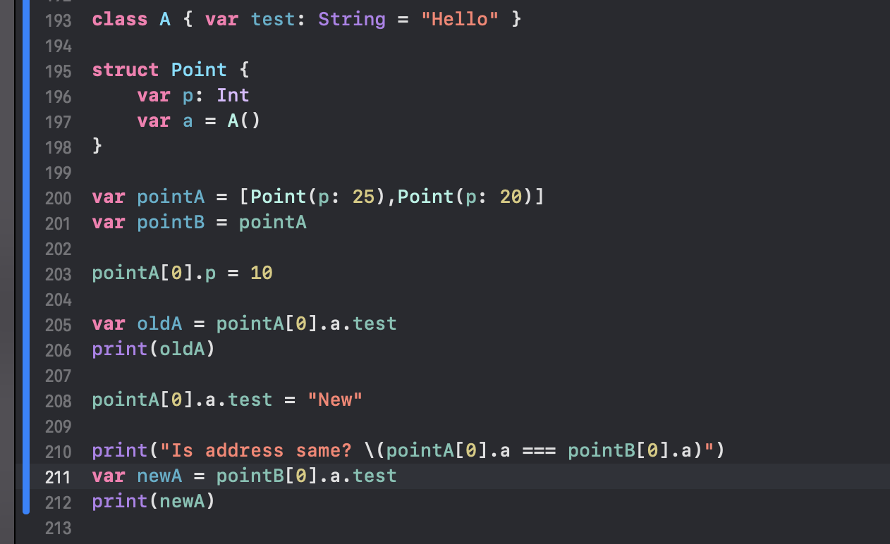 인스턴스에 새로운 타입을 할당한것이 아니라 기존에 pointA 내부에 있는 a 프로퍼티의 A class타입으로 참조가 되었기때문에 같은 주소를 가르키고 있는 것이다.