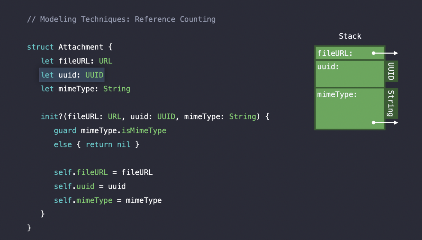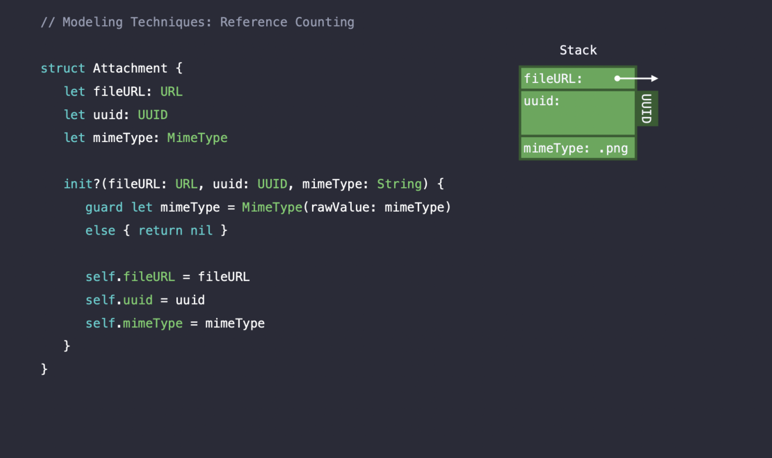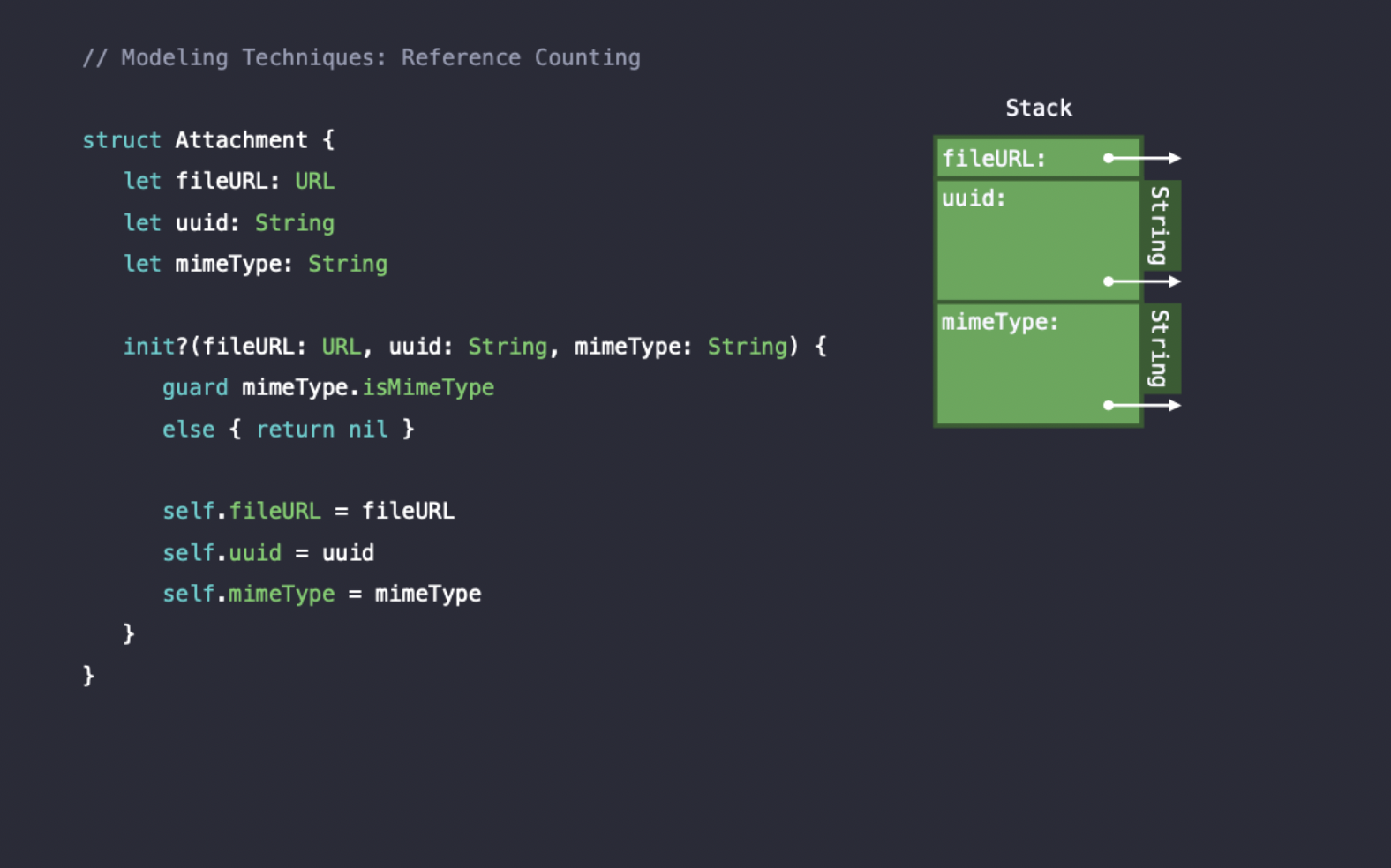 URL은 구조체이지만, String을 생성자로 받아들어지기 때문에 레퍼런스가 발생하고 나머지 프로퍼티는 String이므로 모두 레퍼런스가 발생한다. 3개의 프로퍼티 모두 reference counting오버헤드 를 발생시킨다. 따라서 Attachment 구조체의 인스턴스의 메모리는 다음과 같이 나타난다.