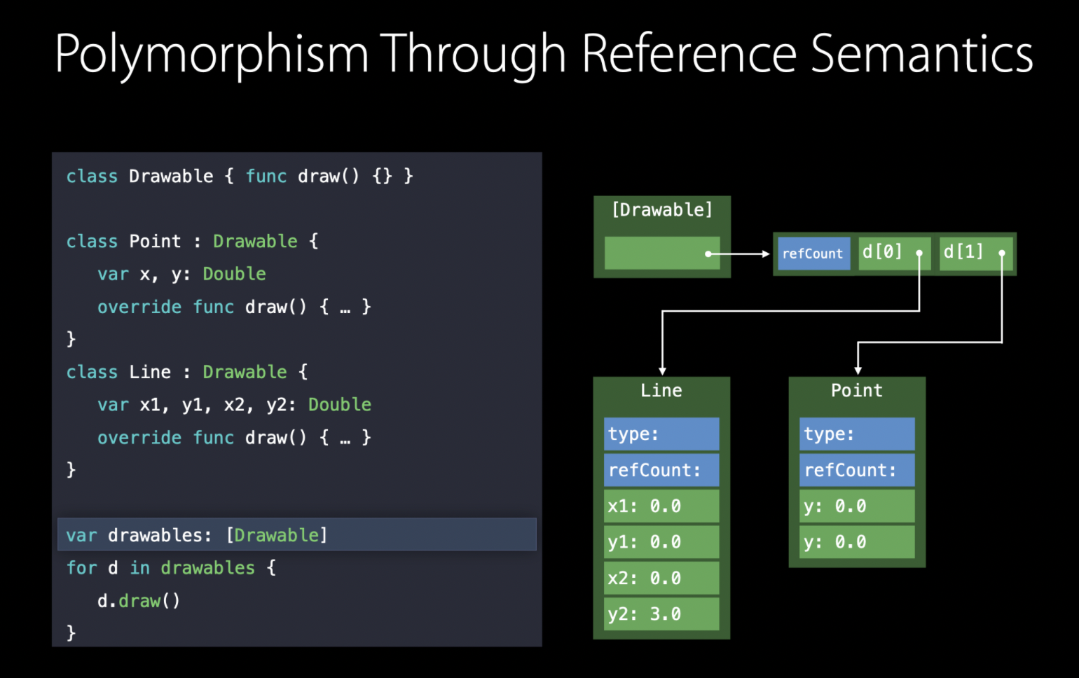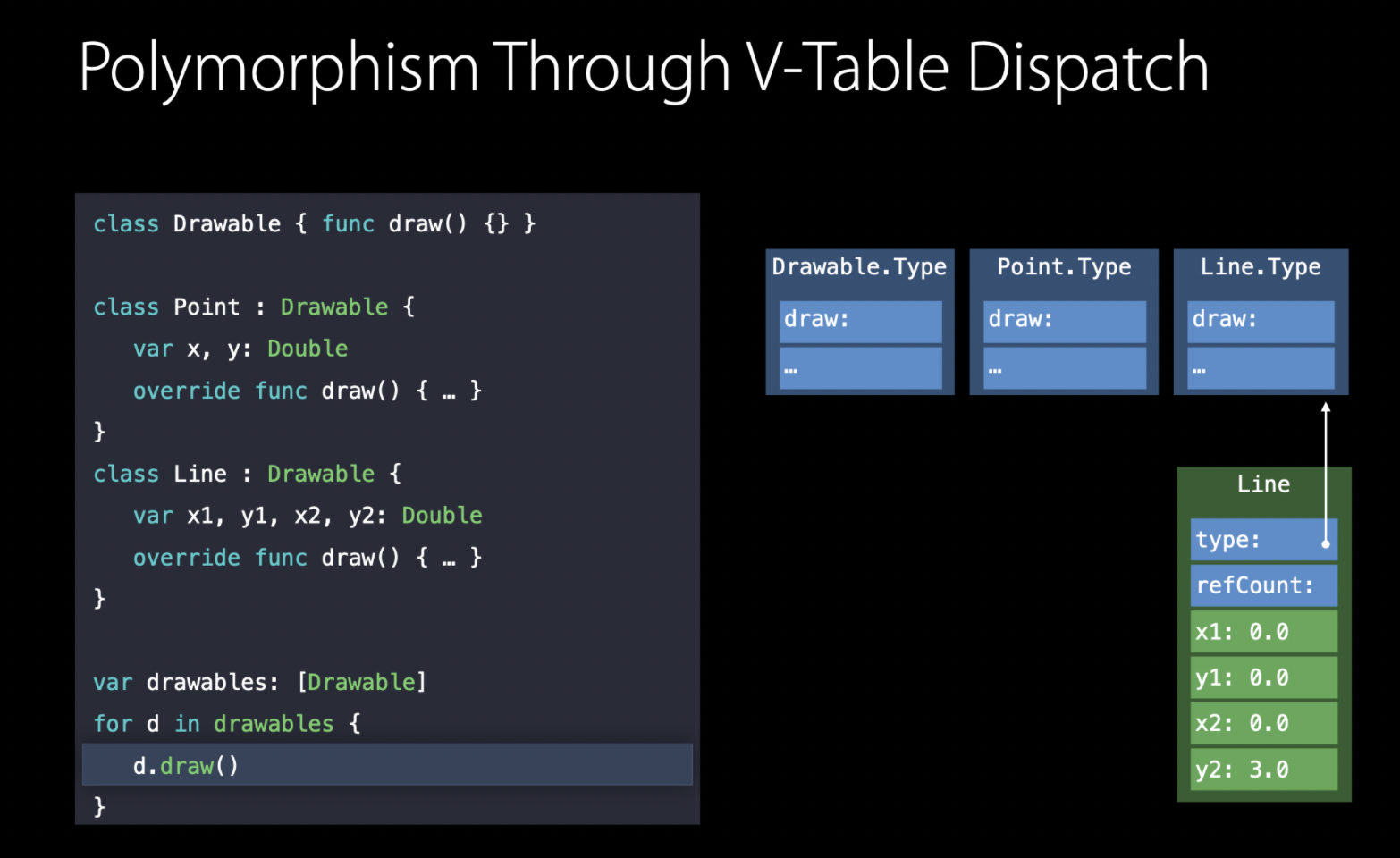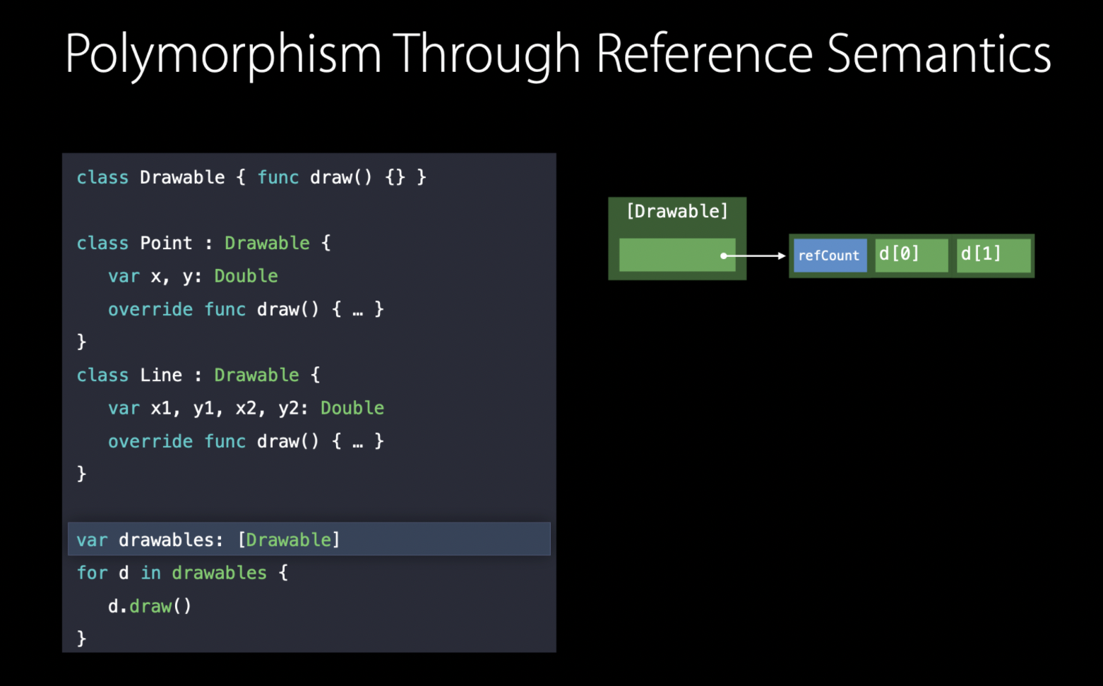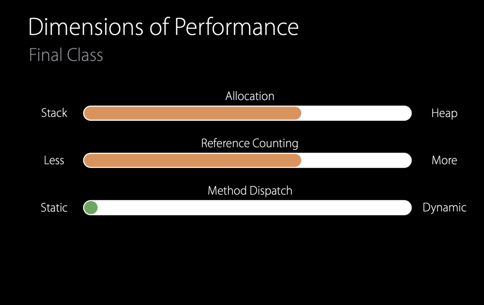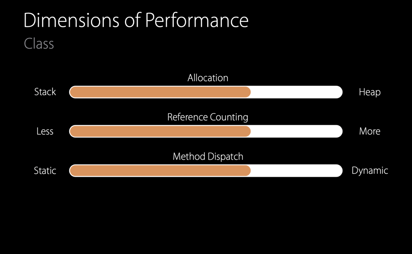 클래스는 기본적으로 heap allocation을 사용하고 이로 인해 reference couting이 발생한다. 또한 dynamic dispatch로 메소드를 호출한다. 하나의 메소드만 봤을때 Dynamic dispatch는 static dispatch와 큰 차이가 없지만, 메소드 체인과 같은 여러메소드가 얽혀있느 상황에서는 메소드 인라이닝과 같은 최적화가 어렵다.