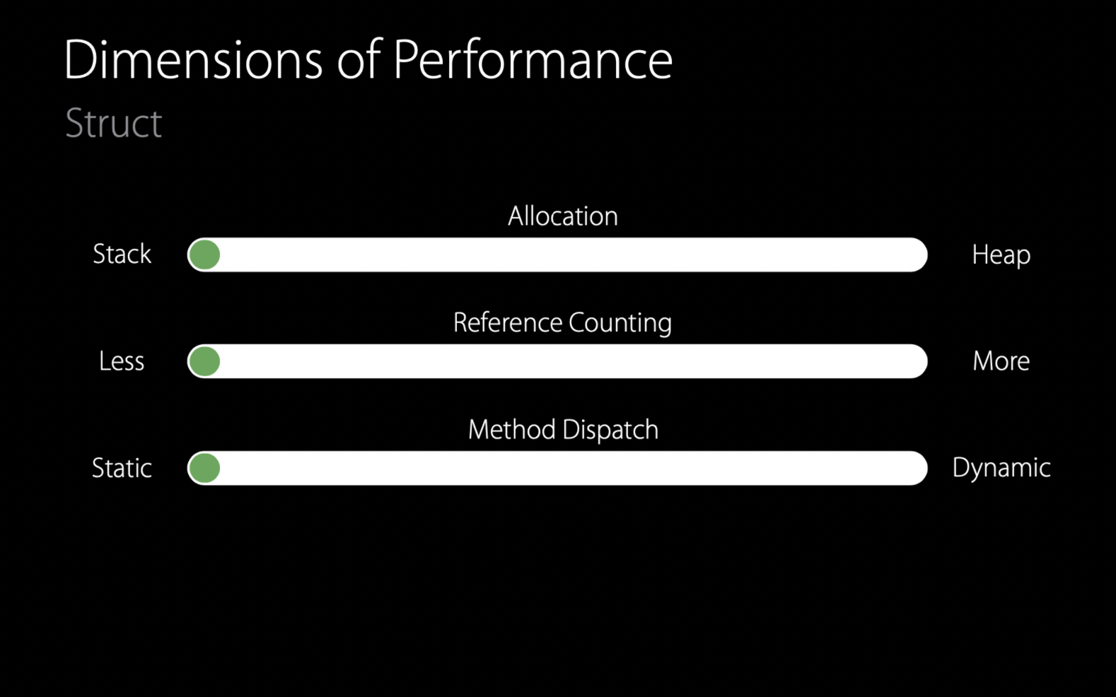 여기서 구조체의 reference counting 오버헤드는 구조체에 있는 레퍼런스 개수에 비례하게 된다. 그래서 만약 구조체에서 하나보다 더많은 레퍼런스를 가지게되면 reference counting 오버헤드가 클래스보다 더 많이 발생하게된다….!!!!!!