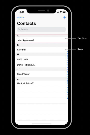 예시) 연락처 앱은 각 연락처의 이름을 연속적으로 표시하고 그사람의 성의 첫 글자를 기준으로 행을 섹션으로 그룹화한다.