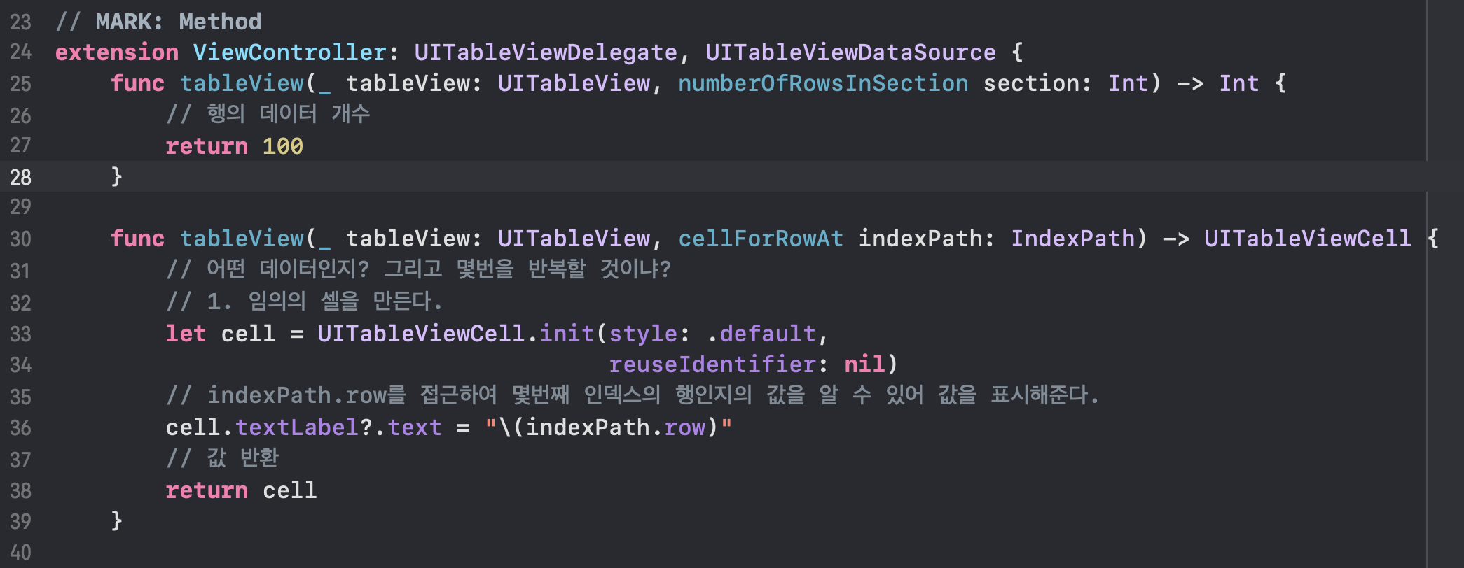 5. tableView메서드들의 주체를 self로 설정해준다.