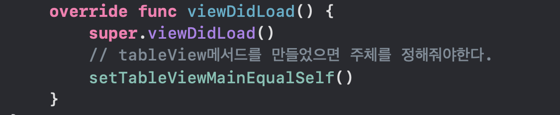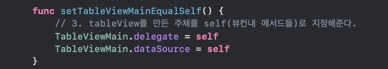 // 3. tableView를 만든 주체를 self(뷰컨내 메서드들)로 지정해준다.