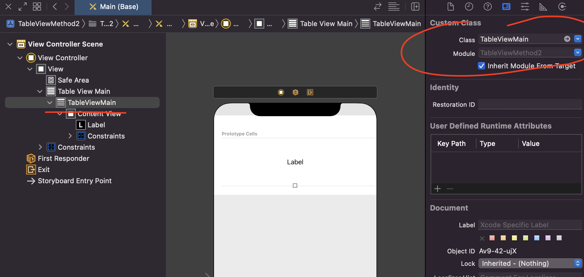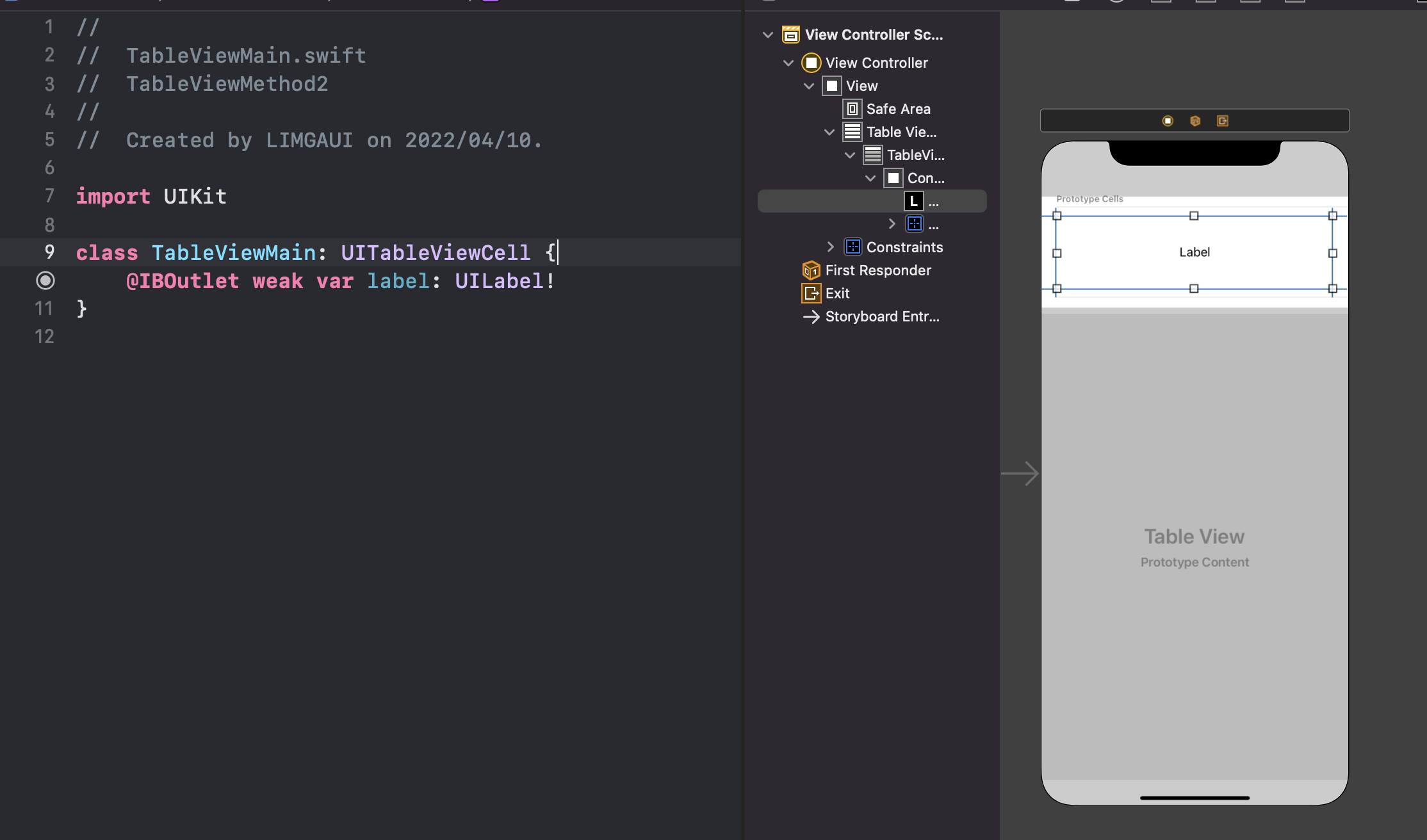 4. identifier를 설정한 이름 그대로 class를 생성 및 TableViewCell의 class를 지정한다.