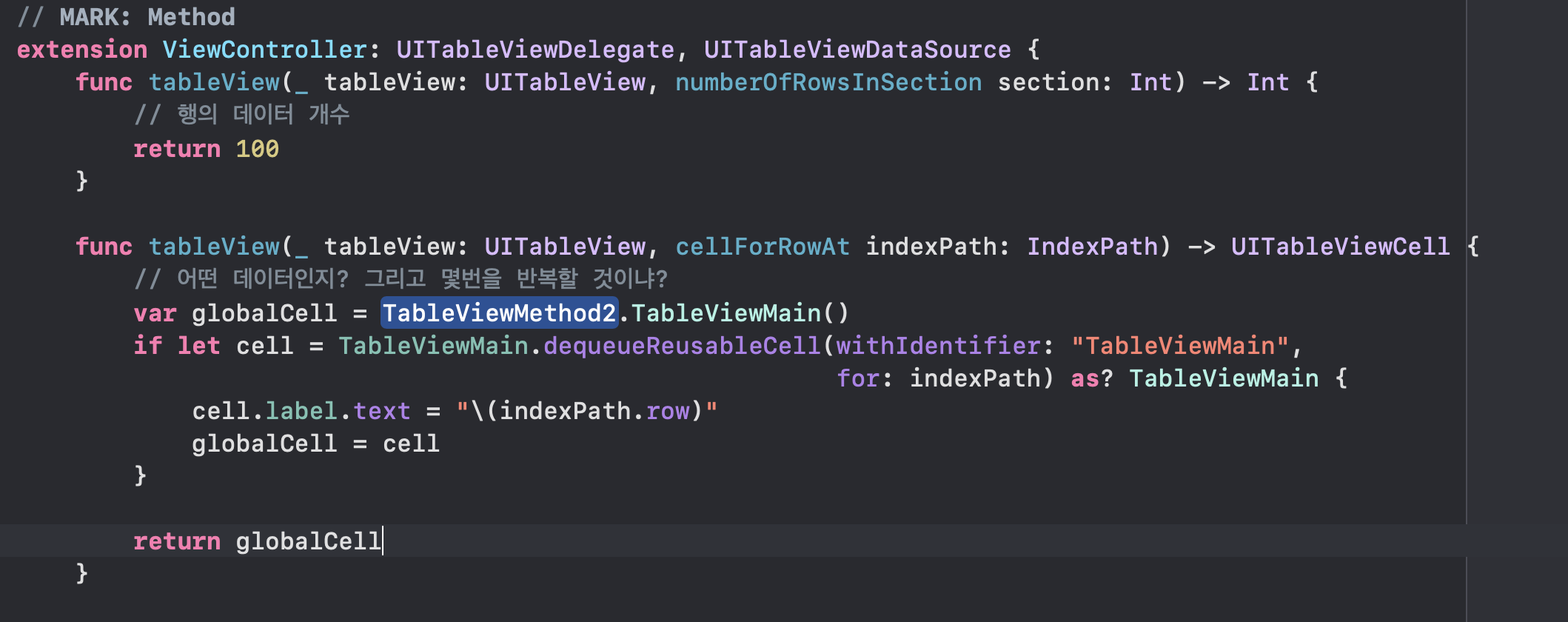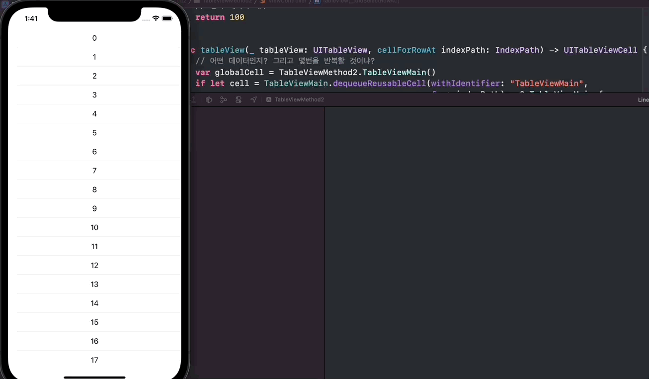 6. tableView메서드내 TableViewMain변수에 dequeueResuableCell메서드 추가 및 친자확인